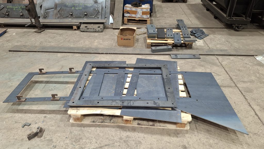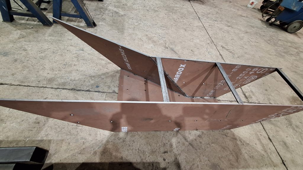Una vez aprobada la ingeniería por el cliente se cortan a laser todas las chapas del conjunto, todas en una resistente chapa de 12, para que pueda empezar el trabajo de los caldereros. Con unos punto de soldadura colocados se comprueban las medidas de los planos antes de dar entrada a los soldadores.
