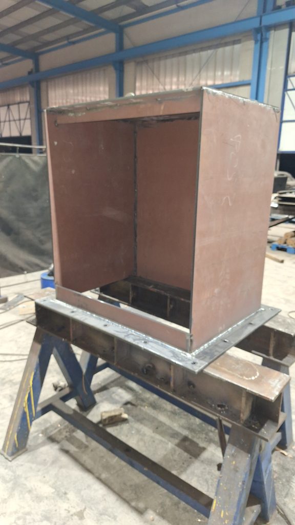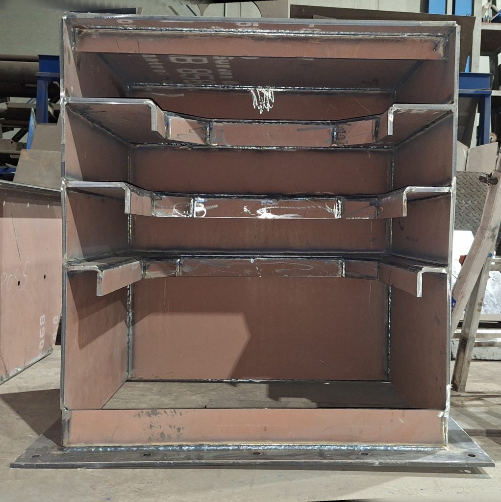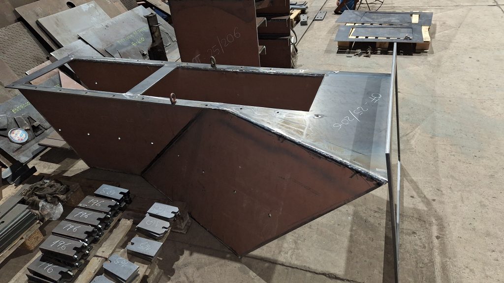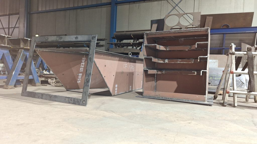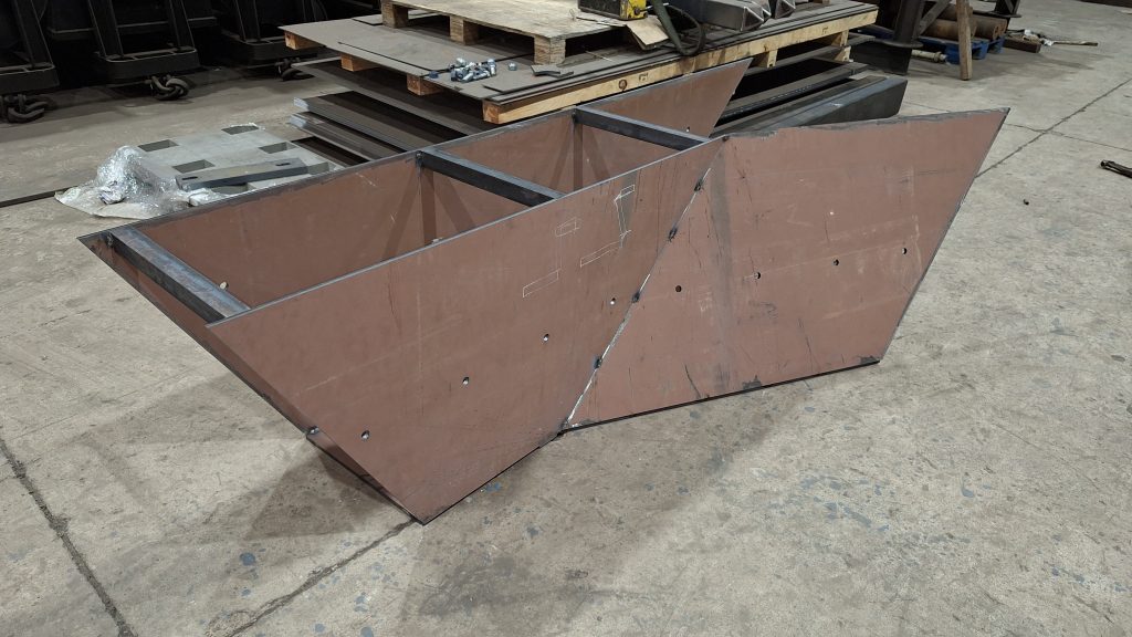 Para sustituir a una vieja tolva simple ya muy deteriorada, que sufría constantes atascos, estamos fabricando una nueva tolva para un cliente del sector de la siderurgia. El interior de la tolva irá recubierta de chapa antifricción, y en el punto crítico del ángulo tendrá una caja de piedras (sistema compuesto por varias pletinas que fuerzan al material a descargar hacia la zona del eje de la salida, al ser esta una tolva con ejes de entrada y salida descentrados).
