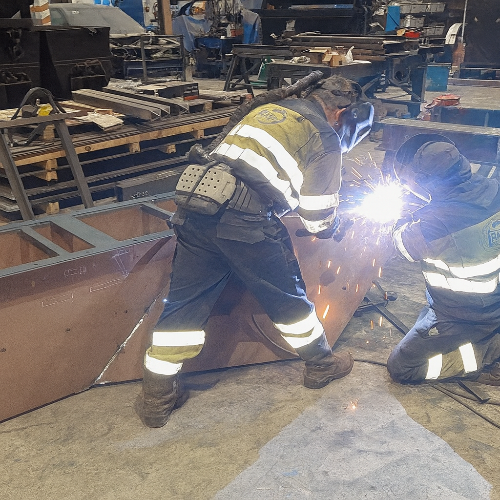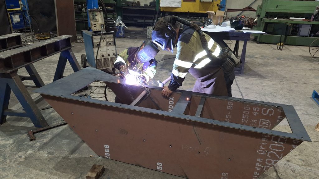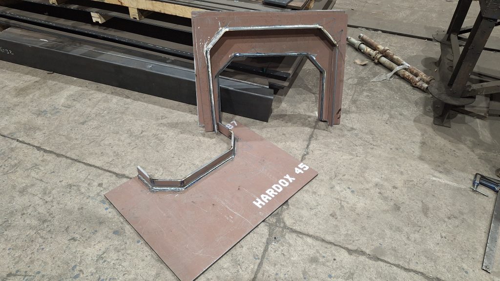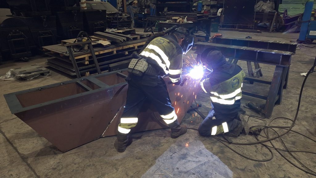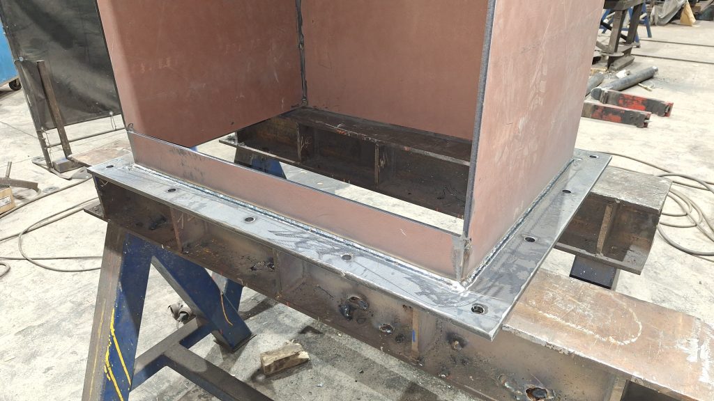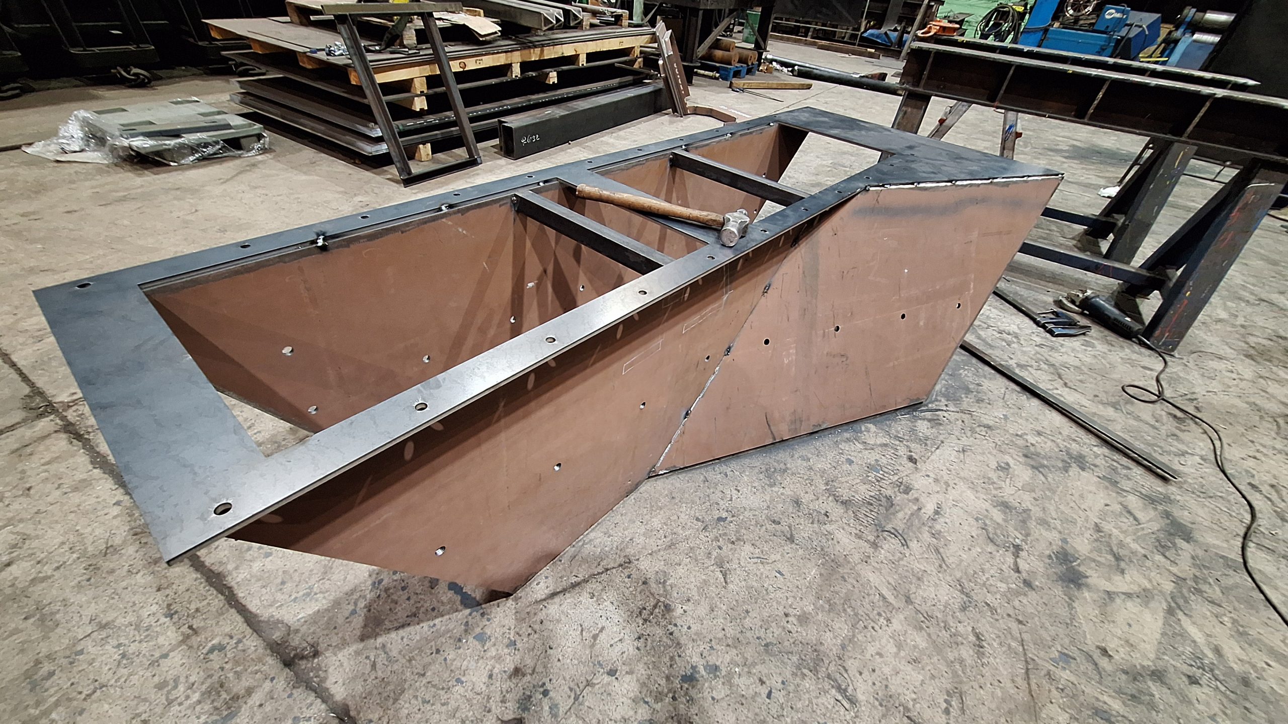 Para sustituir a una vieja tolva simple ya muy deteriorada, que sufría constantes atascos, estamos fabricando una nueva tolva para un cliente del sector de la siderurgia. El interior de la tolva irá recubierta de chapa antifricción, y en el punto crítico del ángulo tendrá una caja de piedras (sistema compuesto por varias pletinas que fuerzan al material a descargar hacia la zona del eje de la salida, al ser esta una tolva con ejes de entrada y salida descentrados).