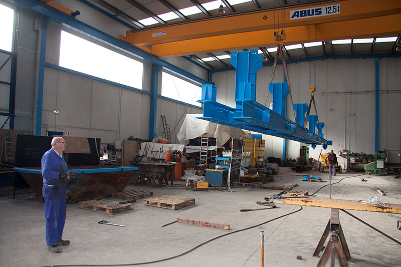 Una vez aprobada la ingeniería por el cliente se cortan a laser todas las chapas del conjunto, todas en una resistente chapa de 12, para que pueda empezar el trabajo de los caldereros. Con unos punto de soldadura colocados se comprueban las medidas de los planos antes de dar entrada a los soldadores.