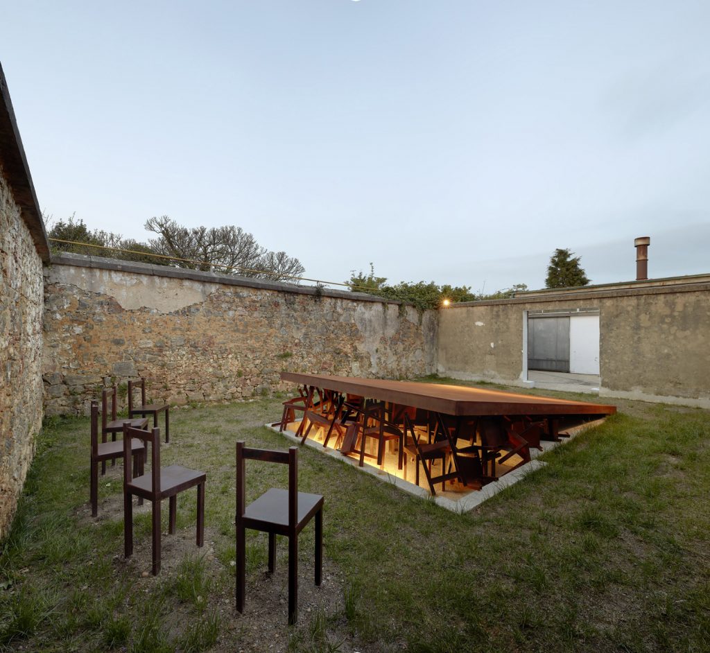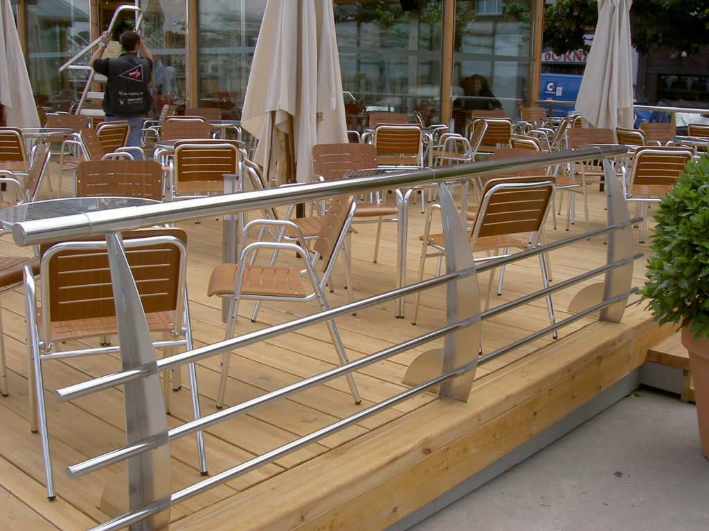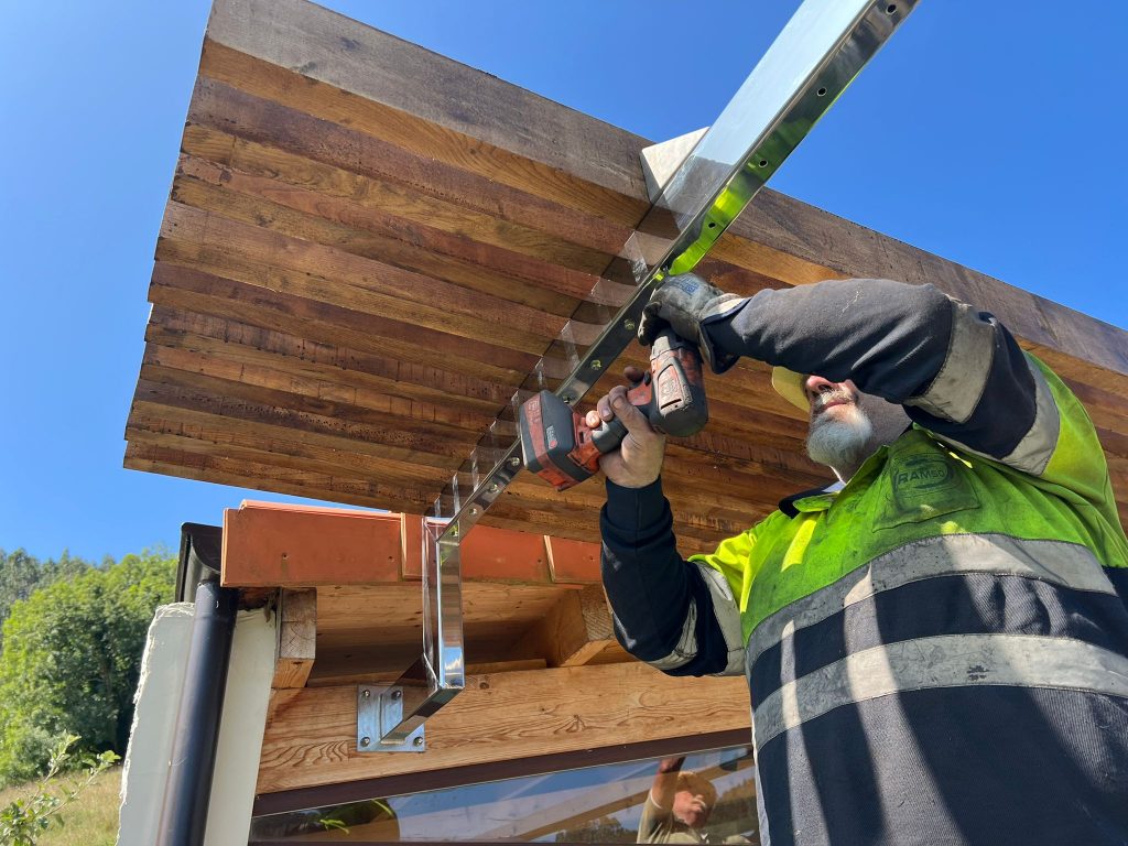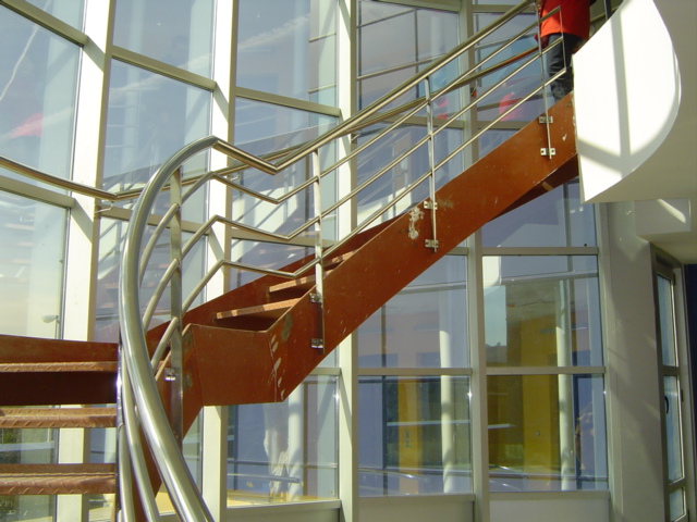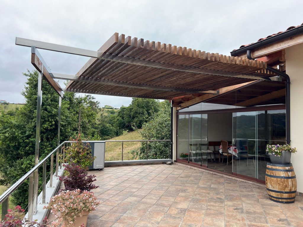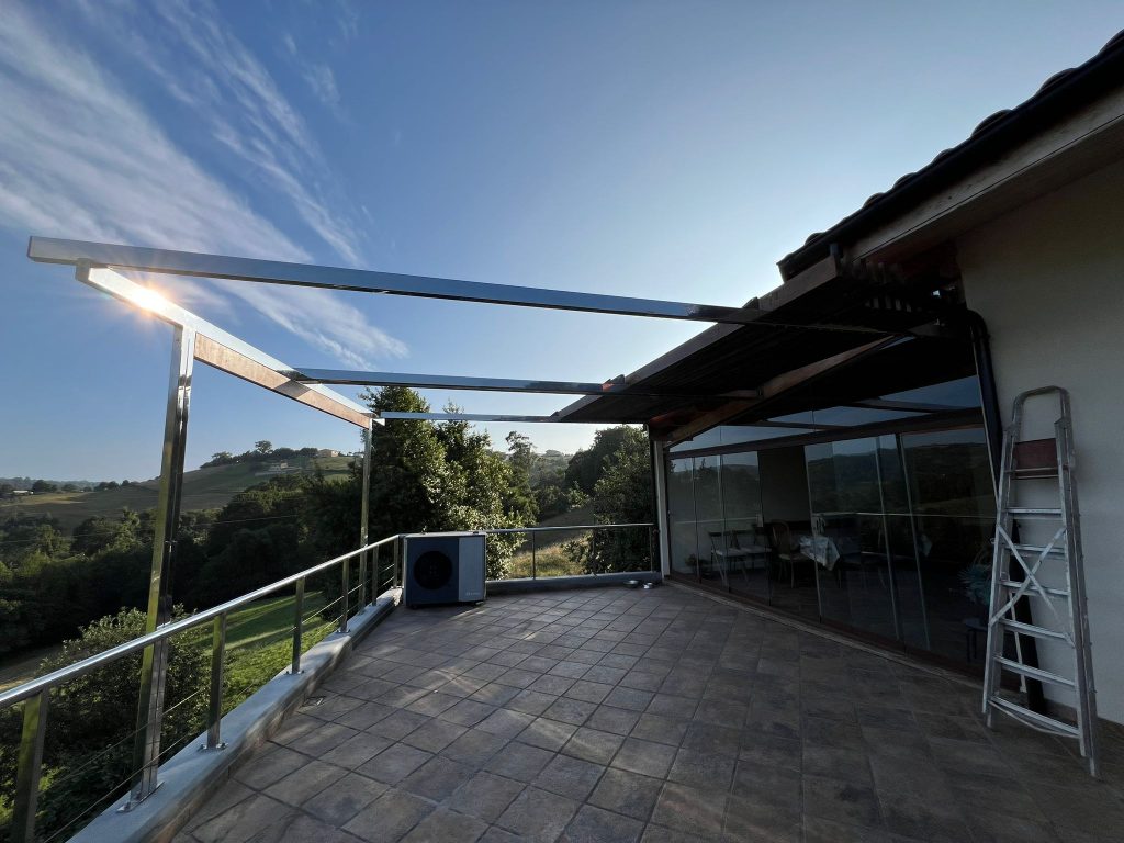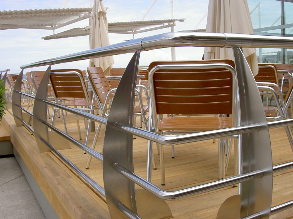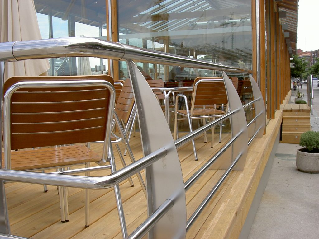 Recubrimiento de patio exterior con estructura ligera de inoxidable, tratado en fases: decapado, lijado en tres etapas cada vez más fina, y por último pulido con trapo para que la estructura quedara brillante. Este tratamiento se ejecutó incluso sobre las soldaduras ejecutadas in situ. La estructura se recubrió con listones de castaño colocados a una distancia que garantice generar sombra incluso en la posición más alta del sol.