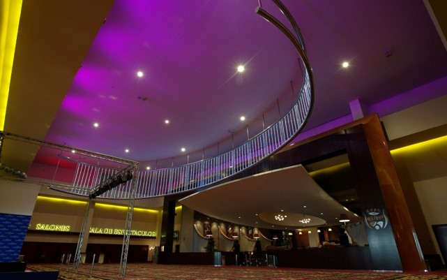 Arpa decorativo en tubería de acero inoxidable de 8”, con iluminación de neón, de 30 mts x 8 mts y 3 mts de altura (Casino de Aranjuez-Madrid)