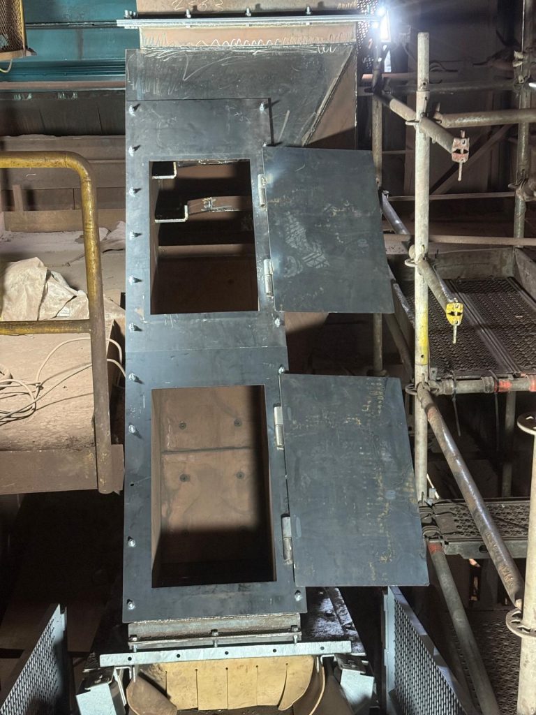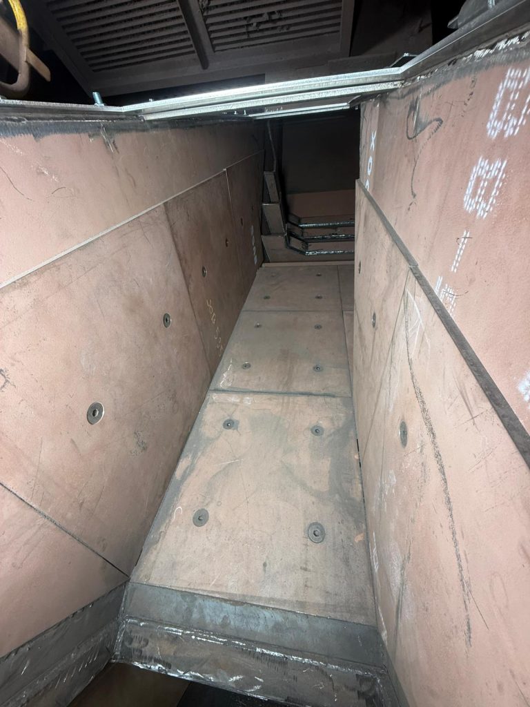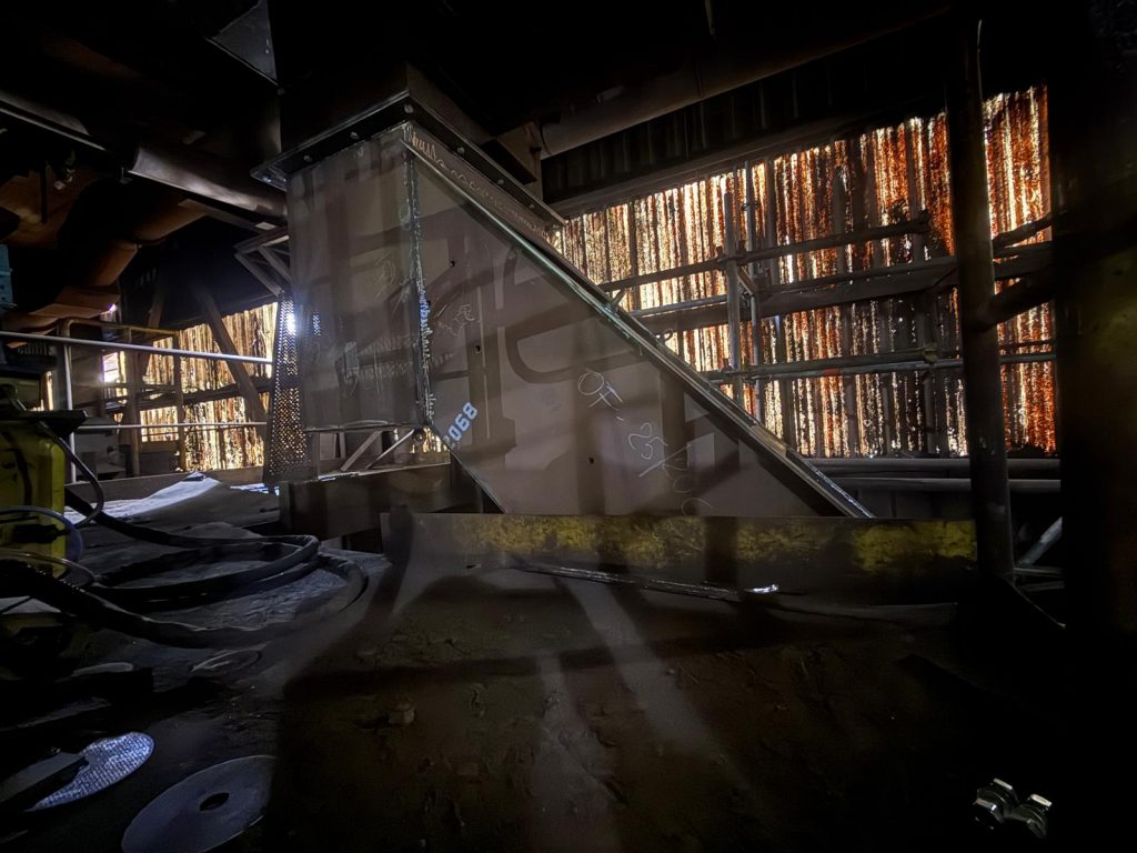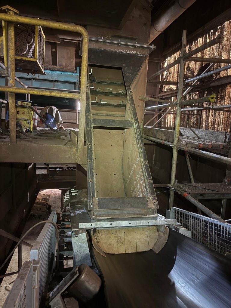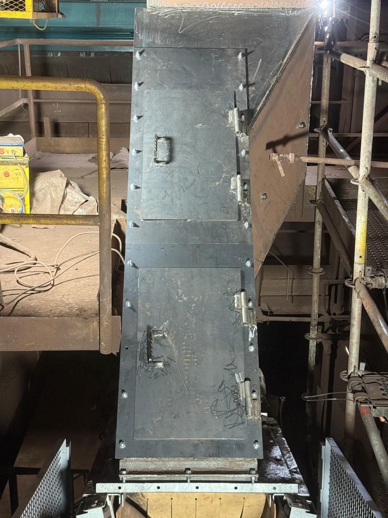Con la segunda parte de la brida ya preparada (la que se soldará a la zona de descarga cuadrada actual), solo queda montar todo en obra (para lo que la pieza ya lleva montadas del taller una orejetas para el puente grúa) y una vez montada añadirle las piezas de chapa antifricción in situ.